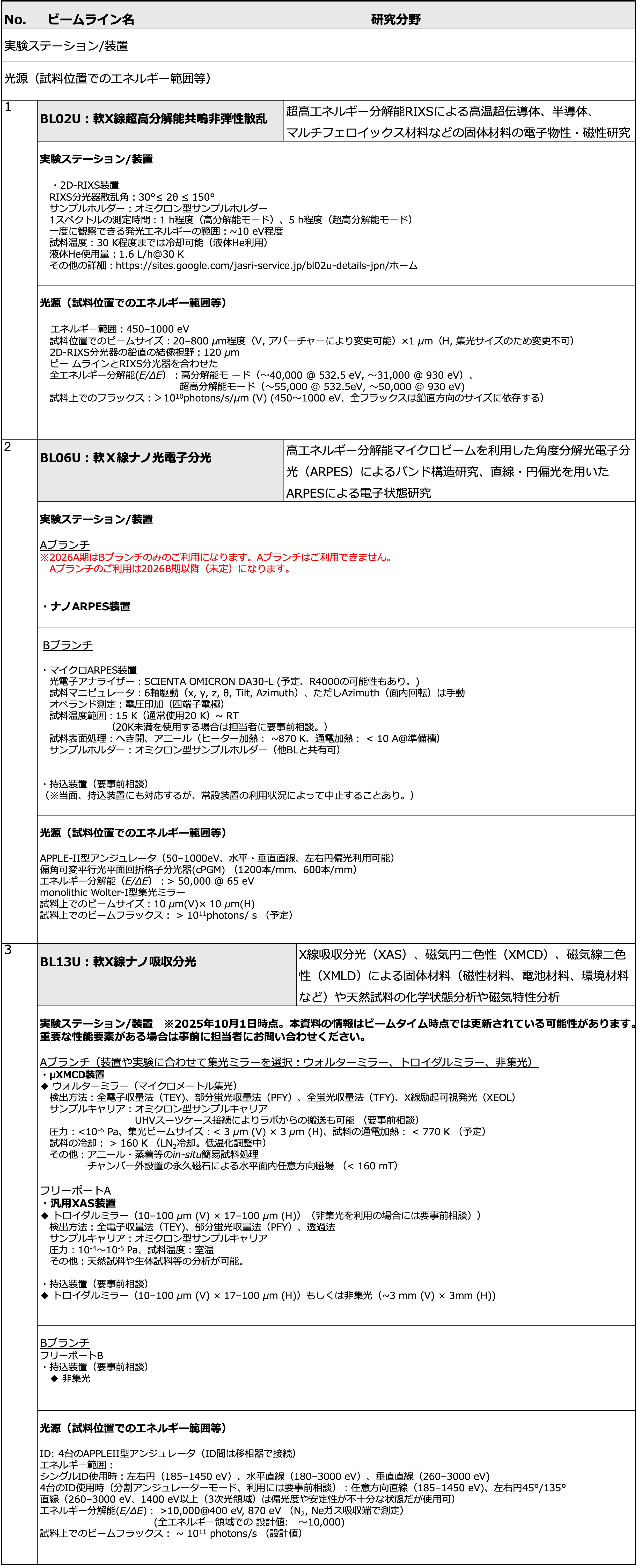 各募集対象ビームラインの研究分野および利用可能な実験ステーション、並びに特徴等を表3、表4、および表5に示します。